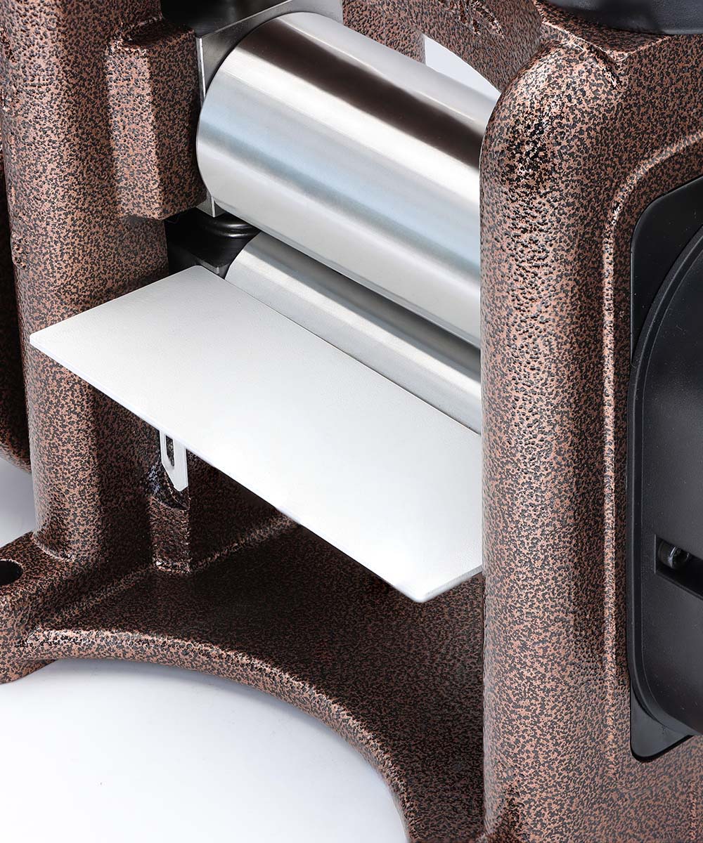 A white powder-coated rear catch tray improves visibility and ease of piece retrieval. The groove pointer bar guarantees precision rolling alignment. Powered by Durston’s hallmark 5:1 reduction gearbox, the mill delivers smooth, effortless rolling performance.