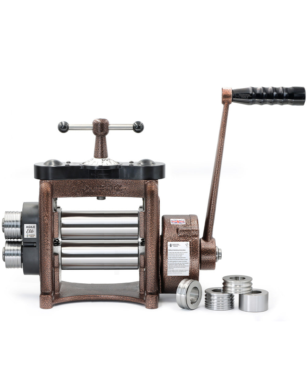 Introducing the Durston Agile Elite F165 Rolling Mill, a standout member of the prestigious King’s Celebration Edition series. This special edition features a robust and visually striking powder-coated copper finish, advanced features, and a full suite of side extensions to enhance your metalworking capabilities.