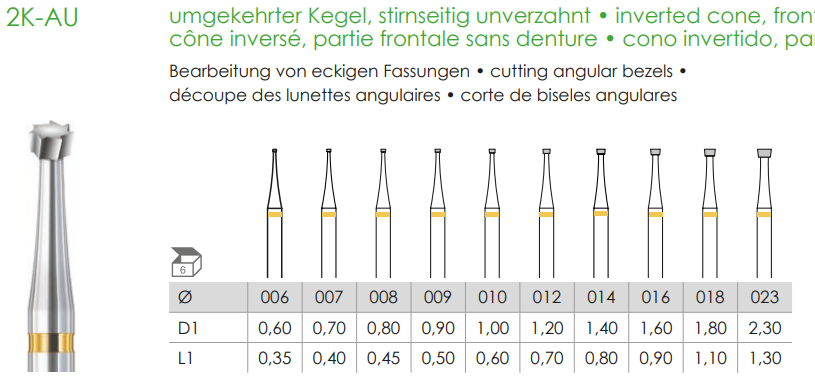 Busch Fig. 2K-AU is a unique and versatile carbide bur designed for jewelry making with a smooth front surface to protect gemstone edges during setting. It combines the functions of a twist bur and round bur in one tool, reducing work steps by at least 50%.
