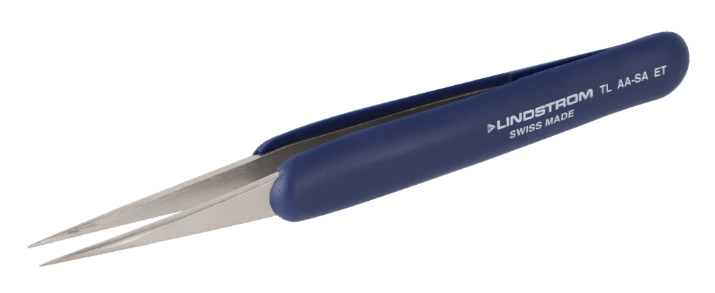 Lindstrom Stainless Steel ESD Safe Ergonomic Tweezers Style AA feature sharp, fine, straight tips for precise and delicate handling of small components. Crafted from high-quality, non-magnetic, acid-resistant stainless steel, these Swiss-made tweezers offer perfect tip alignment, balance, and symmetry, ensuring maximum accuracy for electronics, laboratory, and jewelry work. The ergonomic design enhances comfort during extended use, while the ESD-safe material protects sensitive components from electrostatic discharge. Each tweezer measures approximately 130mm in length and is finished with polished, non-scratching anti-glare edges for professional performance.