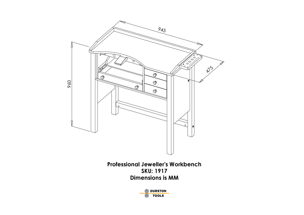 Additional key features are pre-drilled mandrel holes, a durable hardwood bench peg, ergonomic arm supports, and a conveniently side-mounted shelf for tool storage. The workbench ships in multi-transit packaging, which guarantees safe arrival and damage-free delivery. Designed by expert craftsmen, the Professional Wooden Workbench reflects Durston's commitment to quality and responsible material sourcing, ensuring a lifetime of reliable service for professional jewelers.